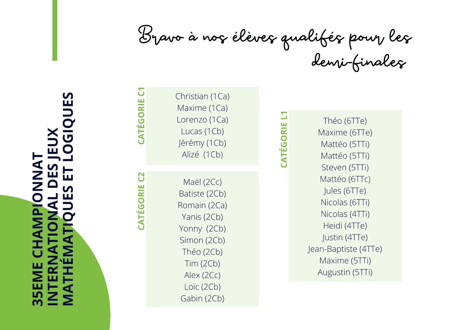 Bien sûr, comme dans tous les concours, seuls les plus performants se qualifient. Vous trouverez ci-dessous la liste des élèves qui défendront leurs chances le samedi 20 mars prochain lors des demi-finales régionales. Cette prochaine épreuve se déroulera également en ligne. Nous leur souhaitons déjà beaucoup de succès.