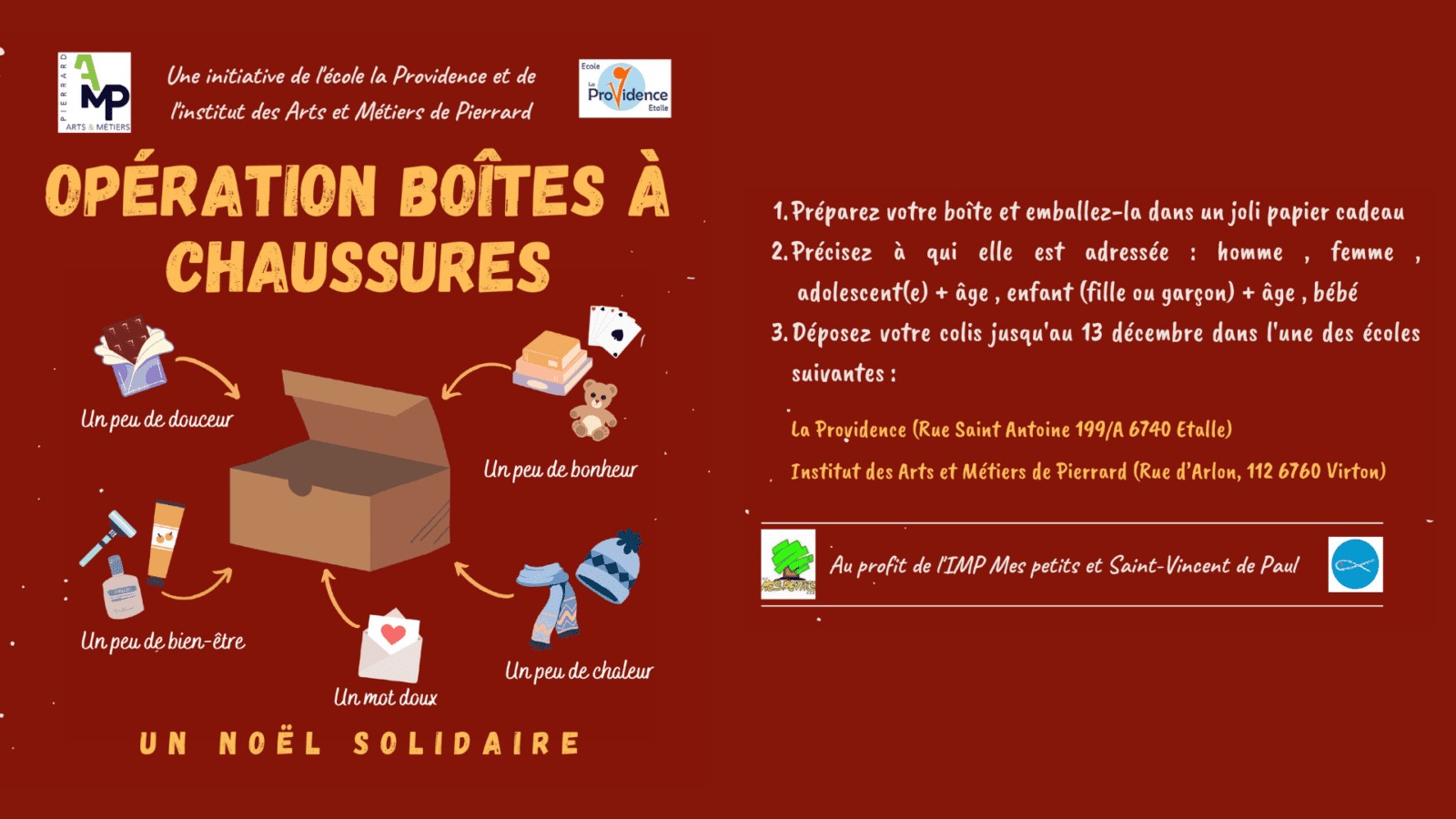 Comme les années précédentes, Pierrard va se mobiliser en faveur des plus fragiles d’entre-nous. Cette fois, nous avons décidé de participer à l’opération « Boîte à Chaussures »
