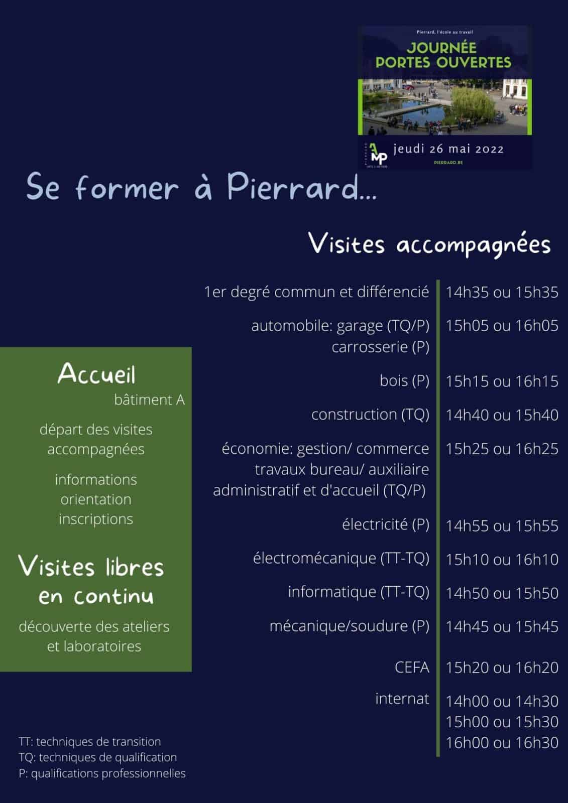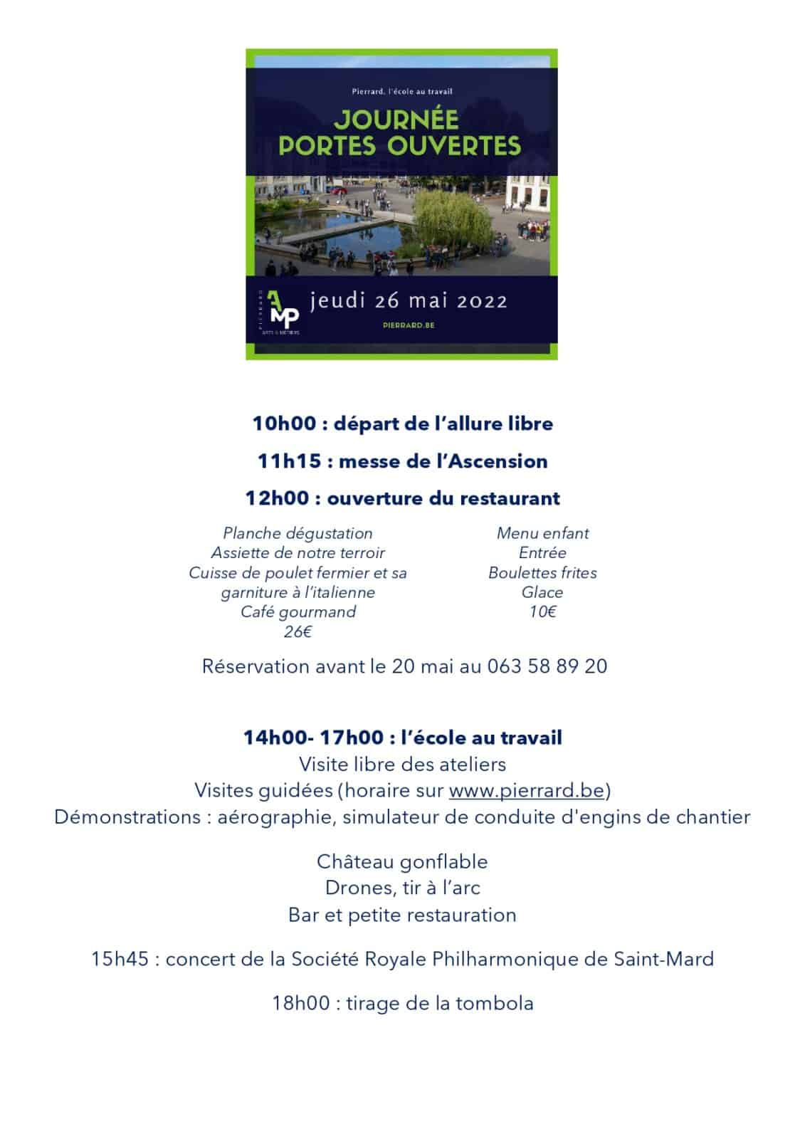Les Aumôniers du Travail, l’Institut des Arts et Métiers, la Haute Ecole de Namur-Liège-Luxembourg, les directions, le personnel, les élèves et les étudiants des deux instituts de Pierrard ont le plaisir de vous inviter avec vos proches à leur journée « porte-ouverte » organisée le jeudi 26 mai 2022, jour de l’Ascension.
