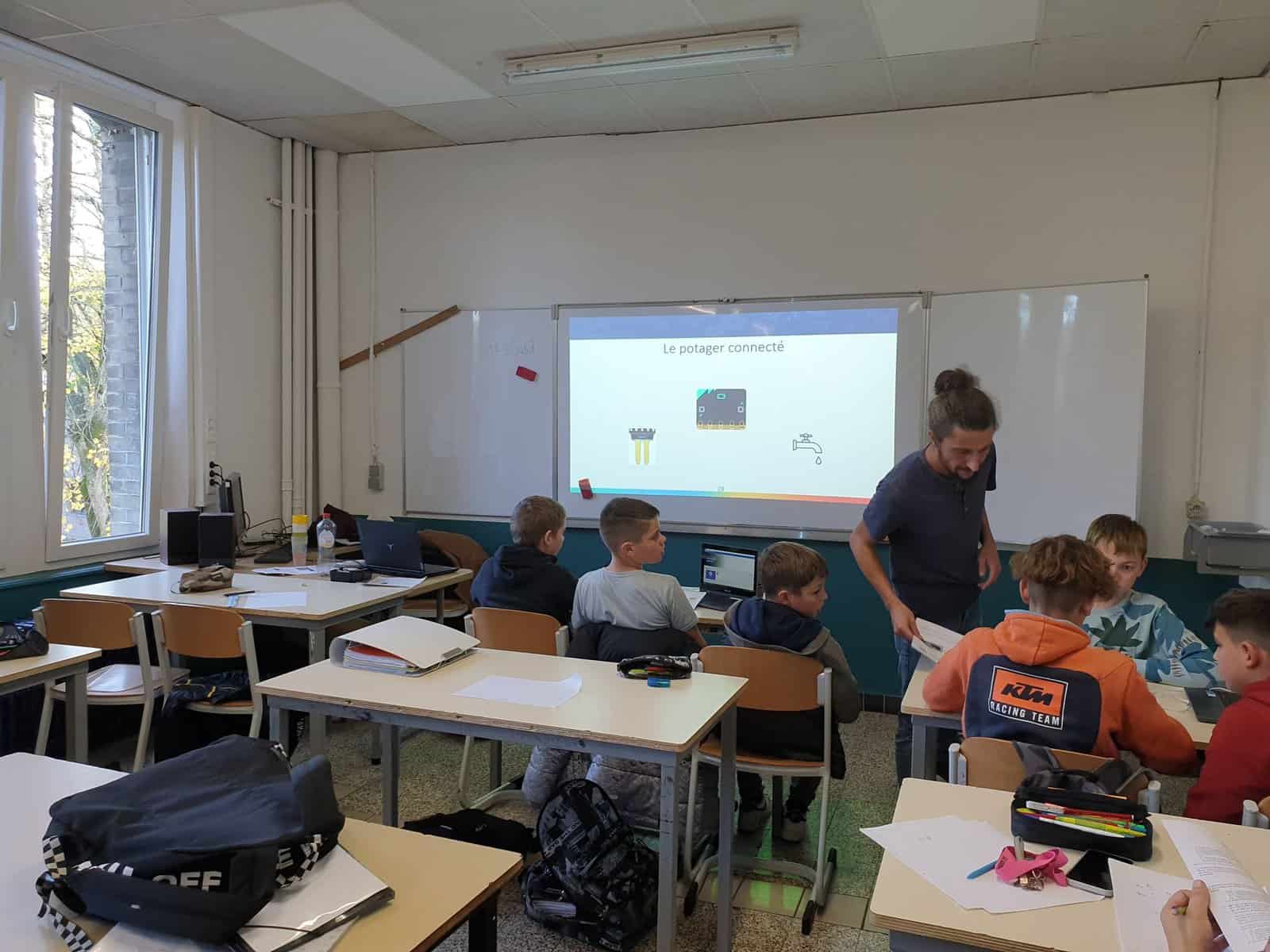 - découvert le microbit et le potager connecté : l’objectif était de comprendre comment fonctionnent les serres connectées pour l’arrosage automatique lorsque la terre est trop sèche (1e commune)