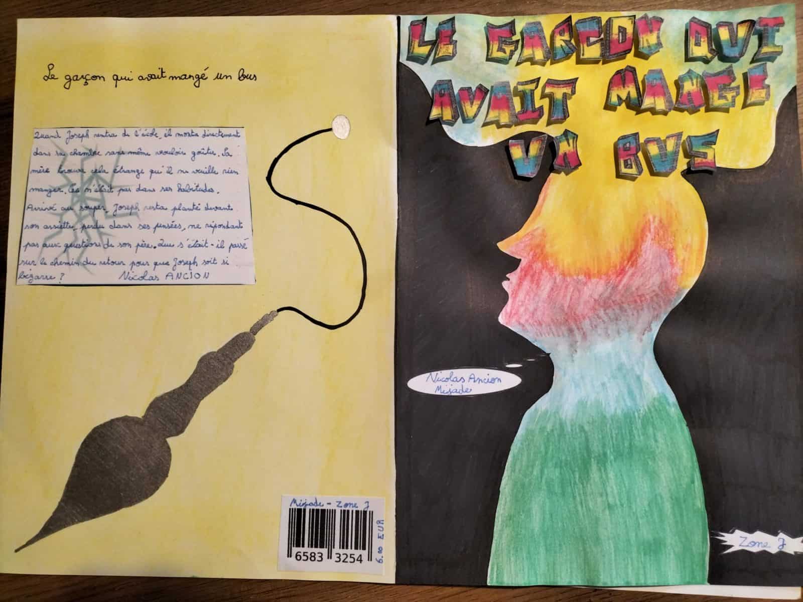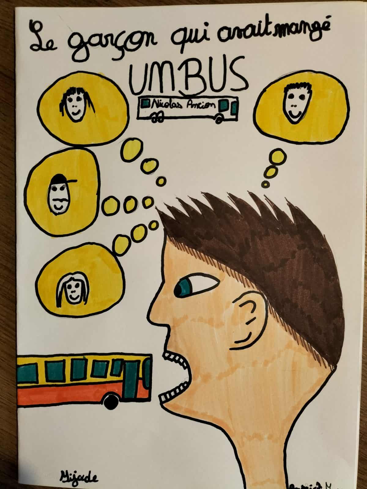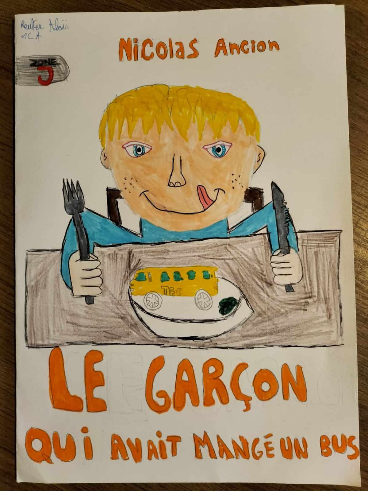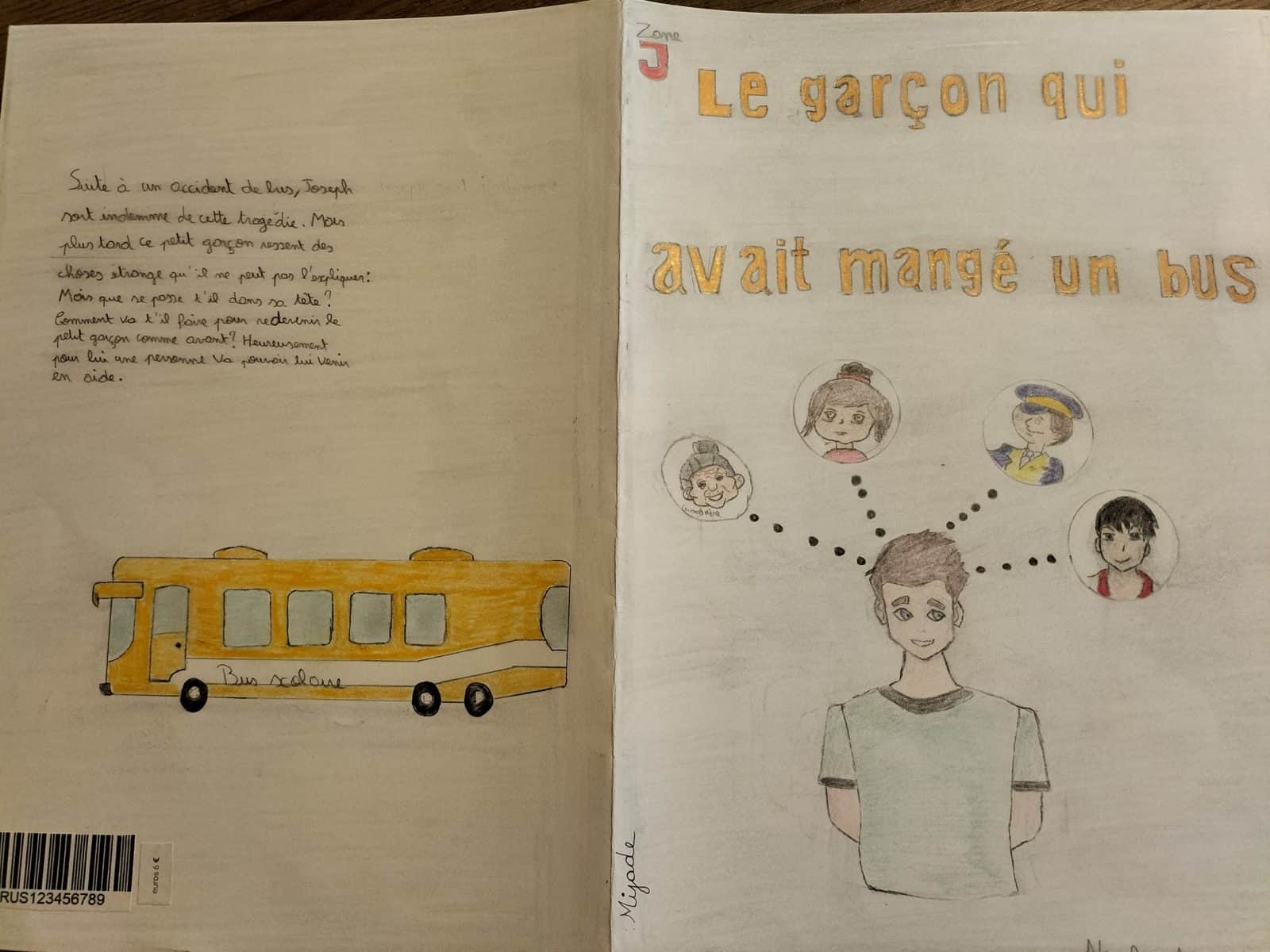 Suite à la lecture du livre de N. Ancion, “Le garçon qui avait mangé un bus”, les élèves d e1e commune ont imaginé une première de couverture en lien avec le contenu du récit ainsi qu’une quatrième de couverture présentant un résumé apéritif. Place à la créativité et à l’imagination!