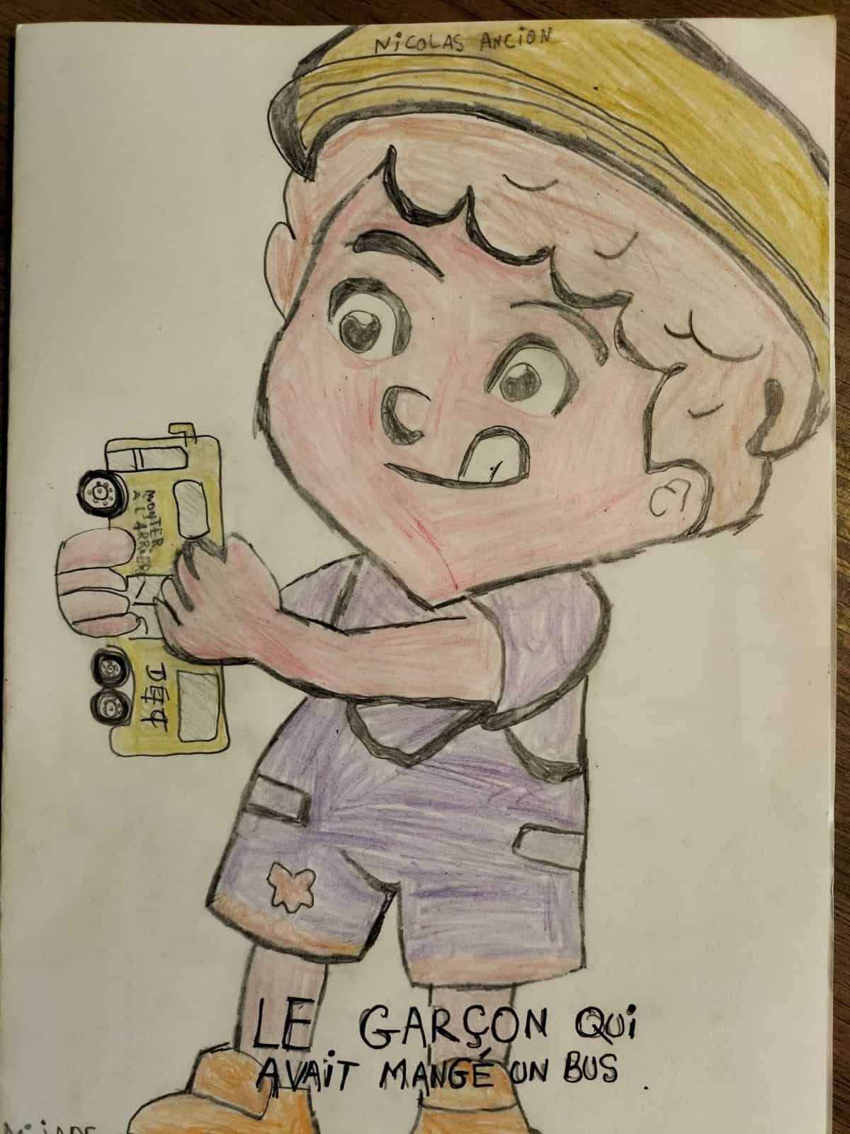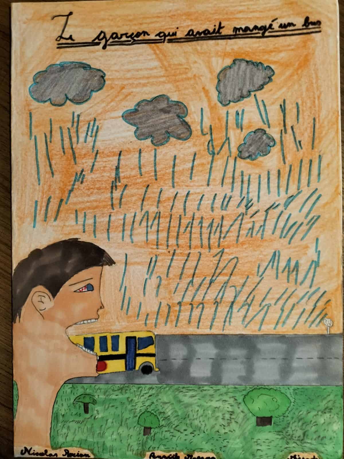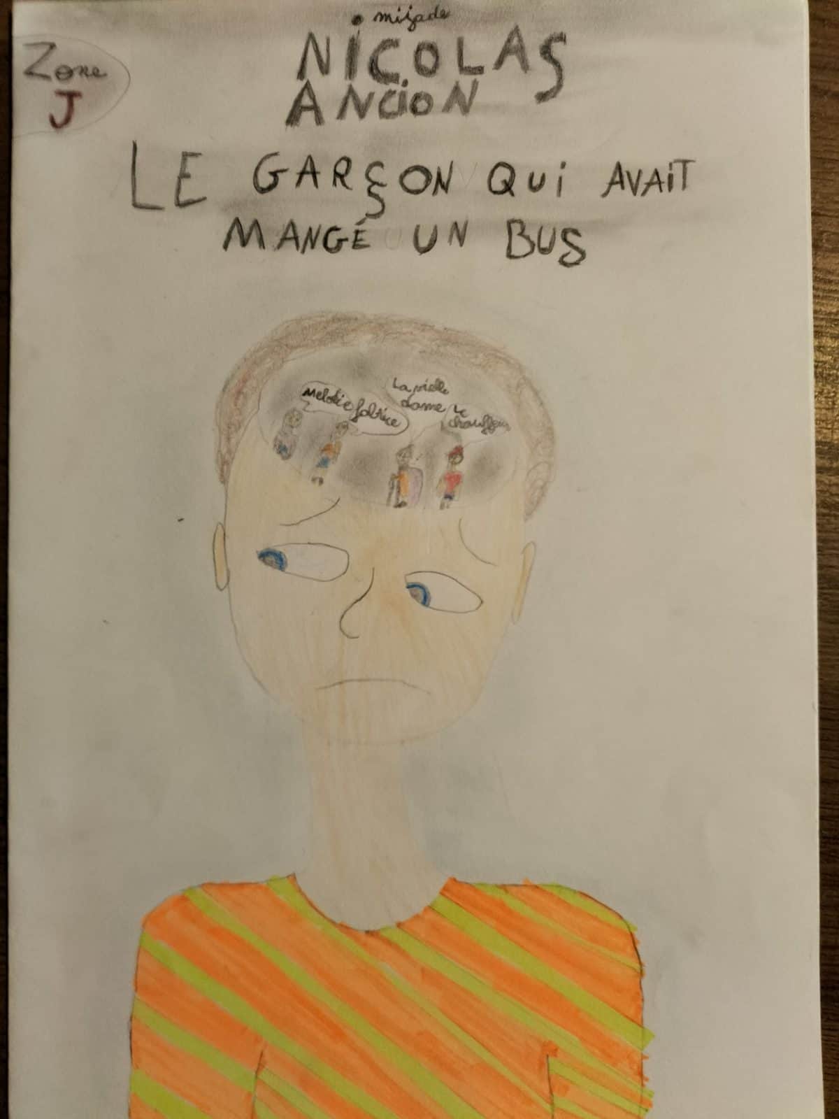 Suite à la lecture du livre de N. Ancion, “Le garçon qui avait mangé un bus”, les élèves d e1e commune ont imaginé une première de couverture en lien avec le contenu du récit ainsi qu’une quatrième de couverture présentant un résumé apéritif. Place à la créativité et à l’imagination!