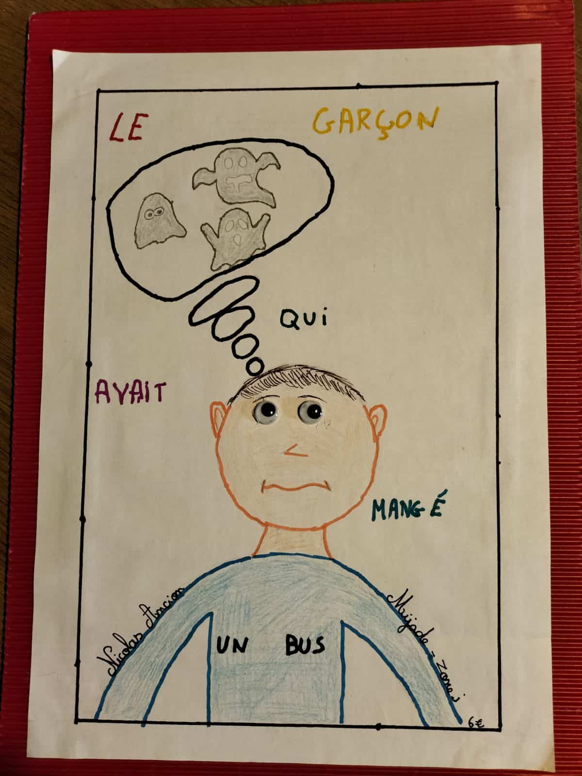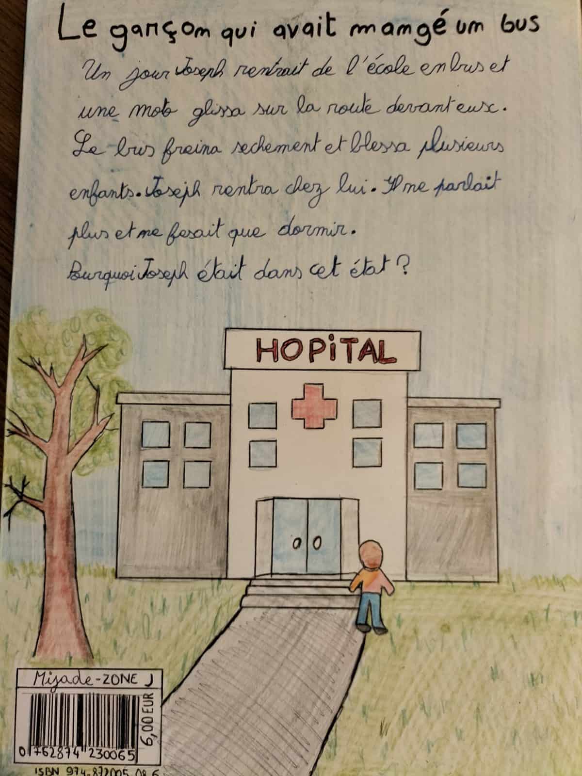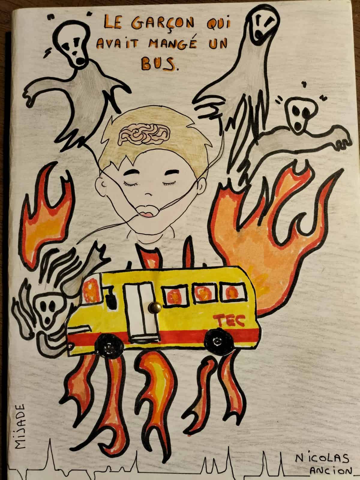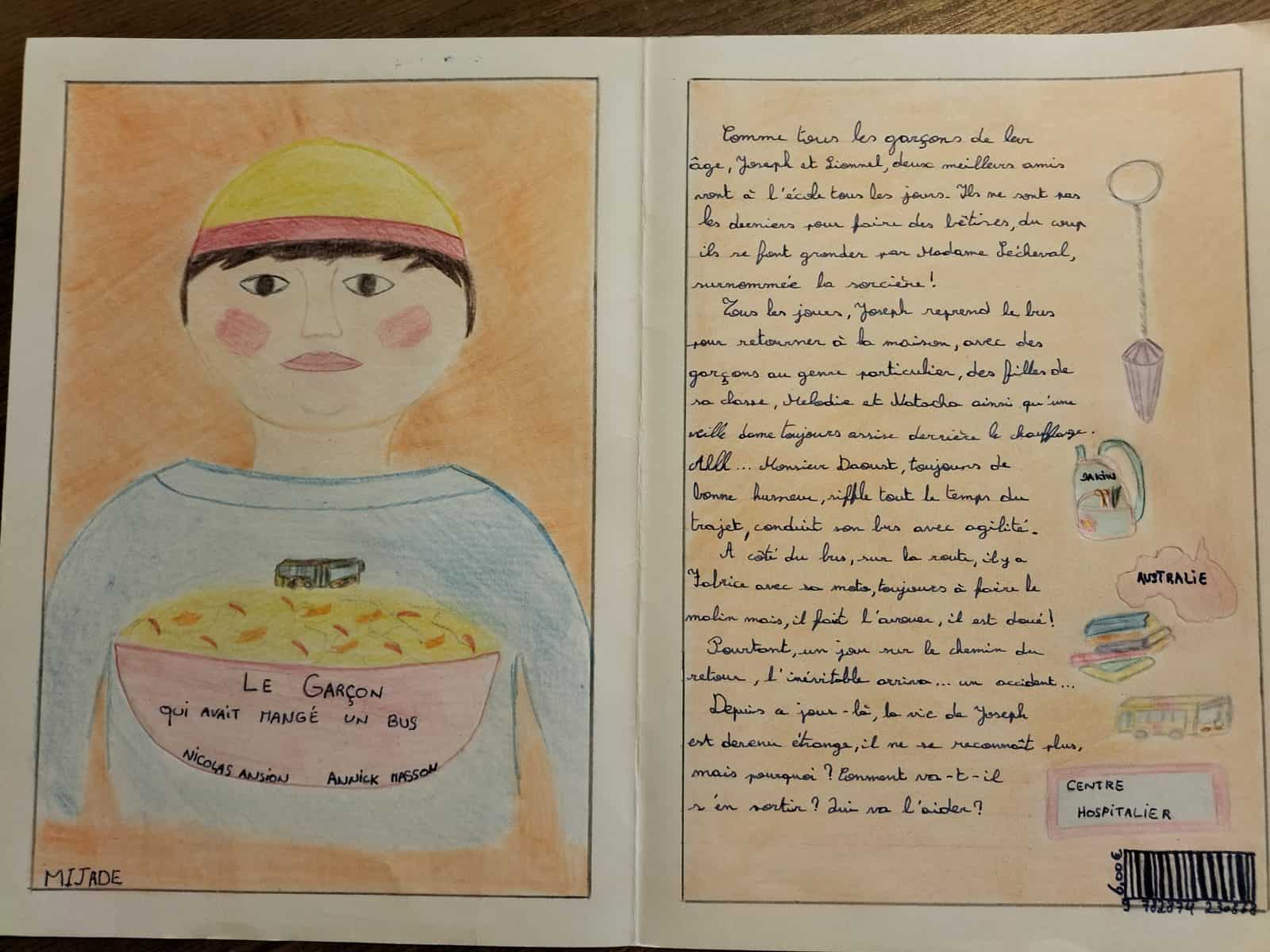 Suite à la lecture du livre de N. Ancion, “Le garçon qui avait mangé un bus”, les élèves d e1e commune ont imaginé une première de couverture en lien avec le contenu du récit ainsi qu’une quatrième de couverture présentant un résumé apéritif. Place à la créativité et à l’imagination!