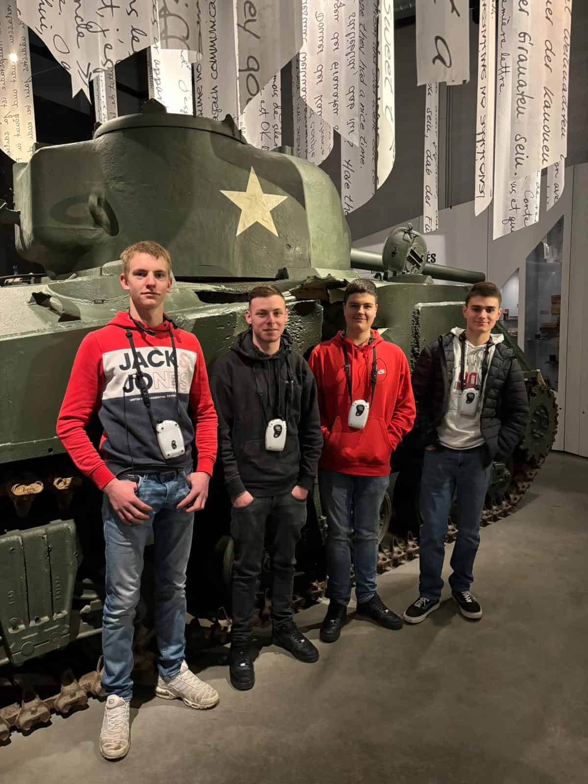 mémoire proposé leur a permis à travers des vitrines, des outils interactifs mais surtout des espaces cinématographiques, de se replonger non seulement dans la bataille des Ardennes mais également dans tout cet épisode douloureux que fut la seconde guerre mondiale. La vie quotidienne des civils confrontés à l’exode, au rationnement, aux bombardements, au choix compliqué entre résistance, pacifisme ou collaboration, … ; celle des soldats combattant en Europe, en Afrique ou en Asie, leurs équipements, leurs véhicules, leurs armes, … tous ces éléments sont richement illustrés tout au long des différents espaces. La visite s’est terminée par un aperçu des années qui suivent la seconde guerre mondiale marquées par la construction de l’Europe et la guerre