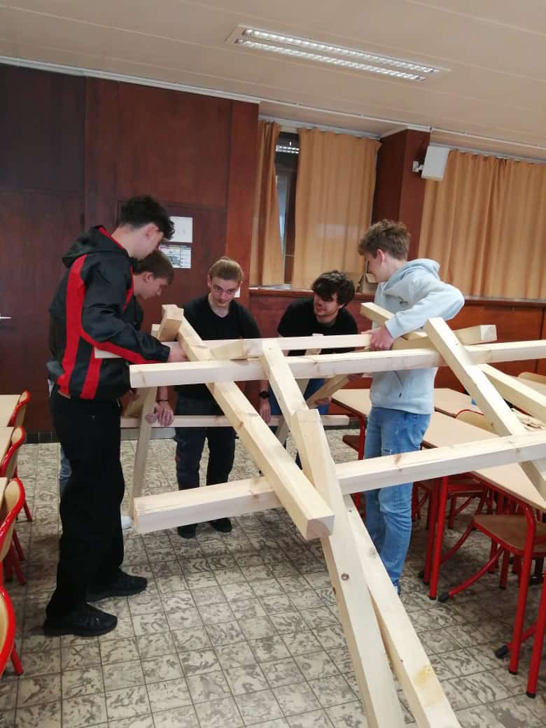 – construction de ponts en bois sans fixations (maquette et grandeur réelle) en mettant en pratique le principe de gravité et de frottement