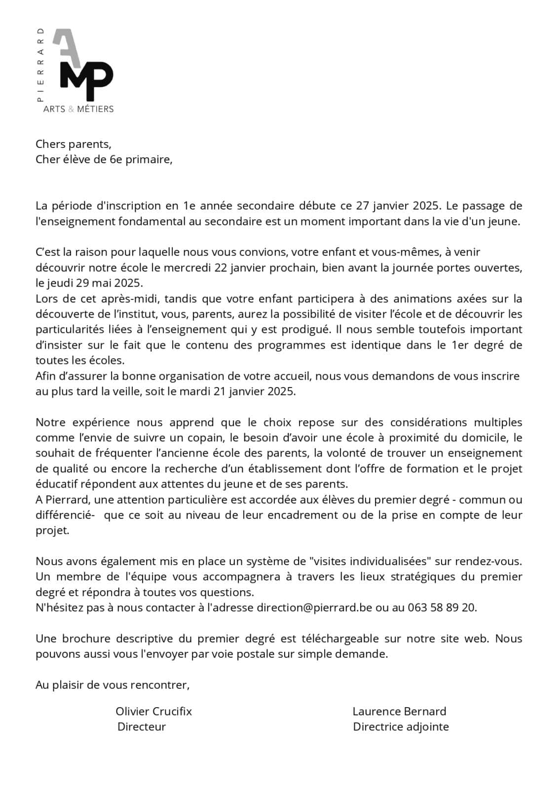 une séance d’information à destination des parents sera organisée pendant que les élèves découvriront une activité complémentaire (au choix) spécifique au 1er degré de Pierrard. Puis, l’équipe éducative vous proposera une visite guidée des locaux du 1er degré.
