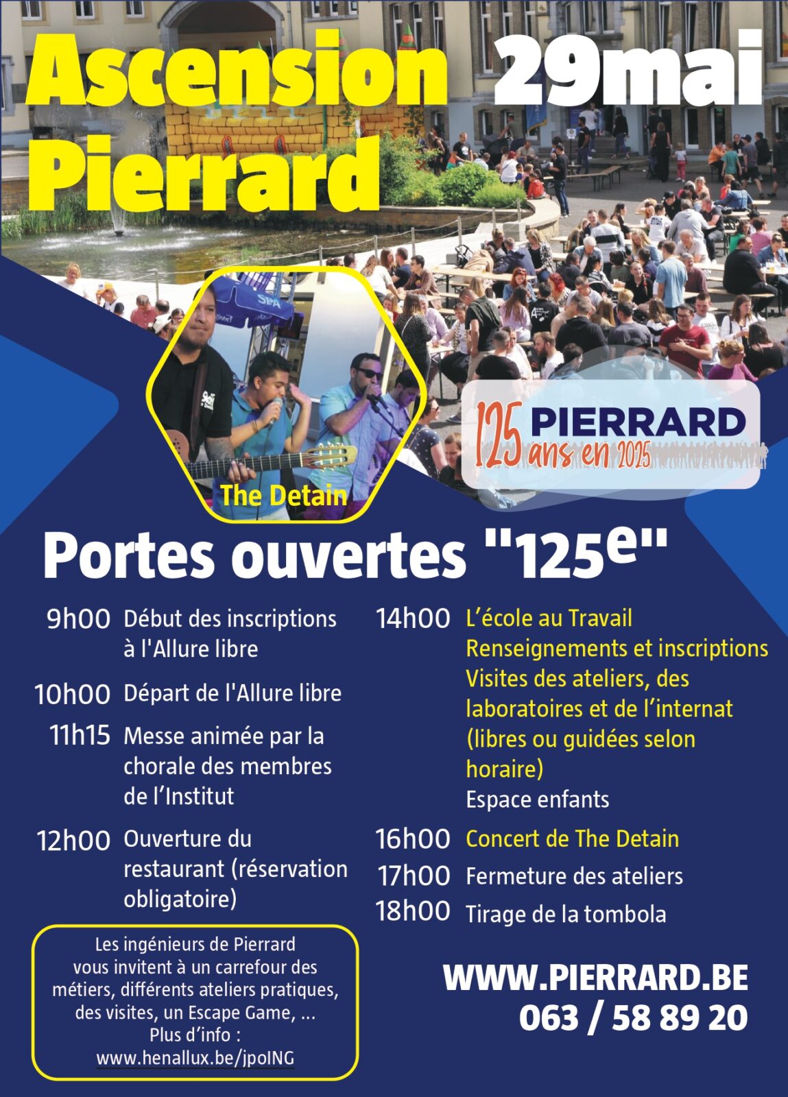 L’Institut des Arts et Métiers, l’École d’ingénieurs de l’Hénallux et l’Association Royale des Ingénieurs Arts et Métiers de Pierrard (ARIAMP) vous invitent à célébrer les 125 ans de Pierrard, les 125 ans d’existence des Ingénieurs industriels et les 100 ans de l’ARIAMP, le 29 mai prochain au cours de la journée portes ouvertes de l’Ascension dont voici le programme.