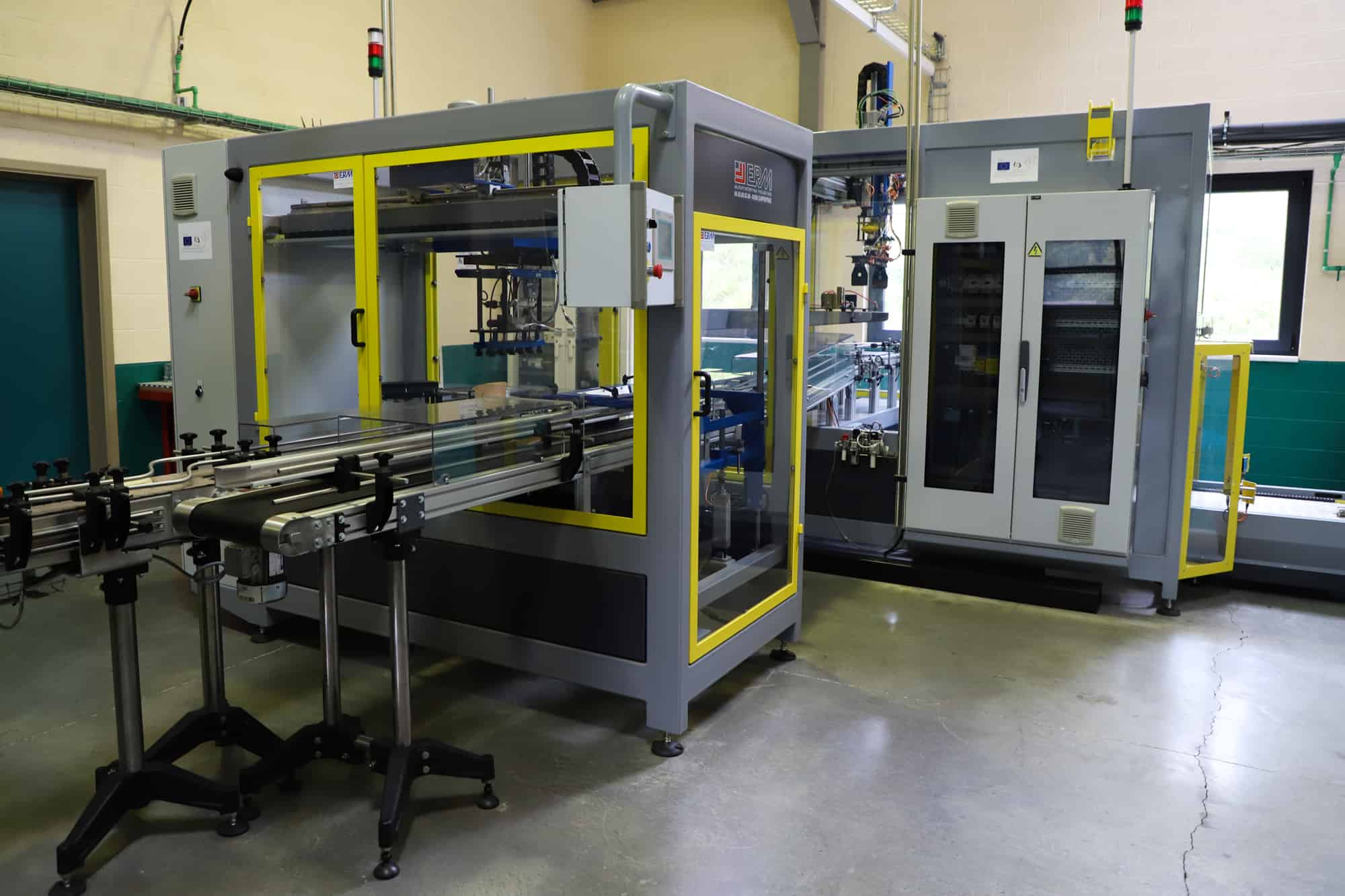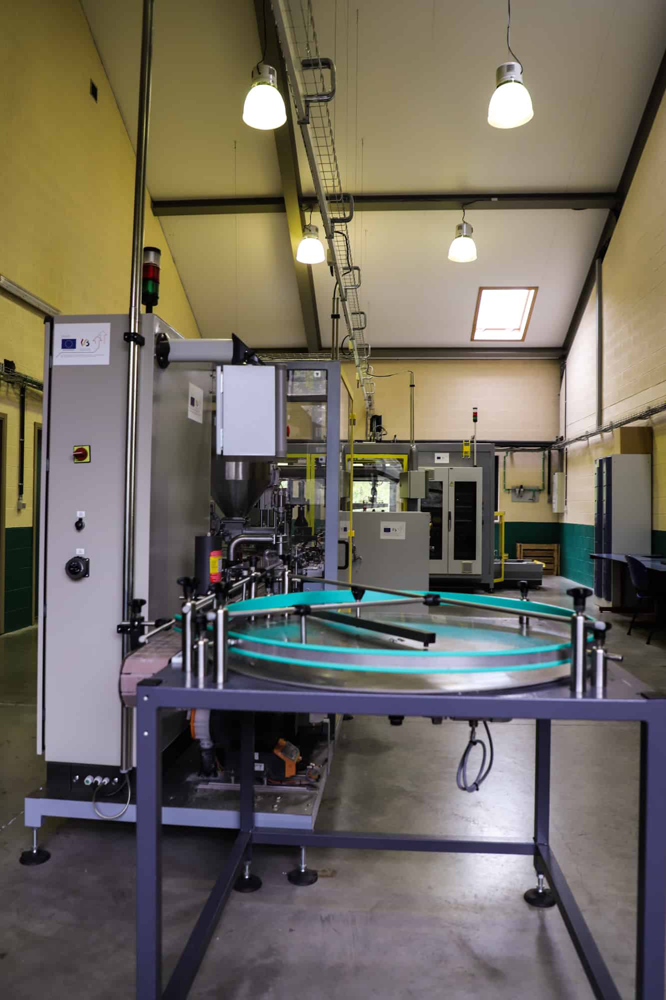Le laboratoire avec la ligne de production didactique complète (granulé ou liquide) de taille industrielle entièrement automatisée avec table de distribution, dosage, bouchonnage, pesage, mise en boite et palettiseur.